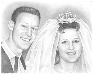 60th anniversary pictureby Mary Kimmer (Sylvania, OH, US)We were so pleased with our parents 60th picture. The original I sent them was of poor quality but this artist stuck with it and we were able to recreate there wedding photo. I would not hesitate to have additional drawings done through them.