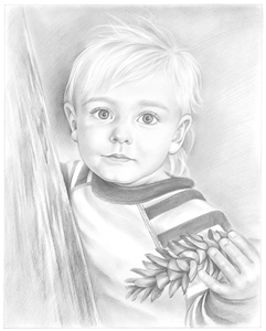 Great attention to adjustmentsby Barbara McWee (Oakland, MI, US)Because our grandchild's face was scrunched up as the butterfly landed on her nose and was quite obscured by a shade in the original photograph, it was difficult to make her face look just like her. DaVinci reworked the drawing with the assistance of additional photos we provided and the end result was a treasure.