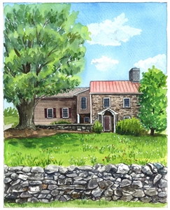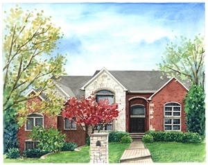 Excellent watercolor captures the look and feel of this sentimental property. The artist removed overgrown brush from the scene and really fixed the appearance which had become obscured. The detail is exquisite such as showing individual bricks in the house and chimney. The overall balance of color and texture is sublime.
